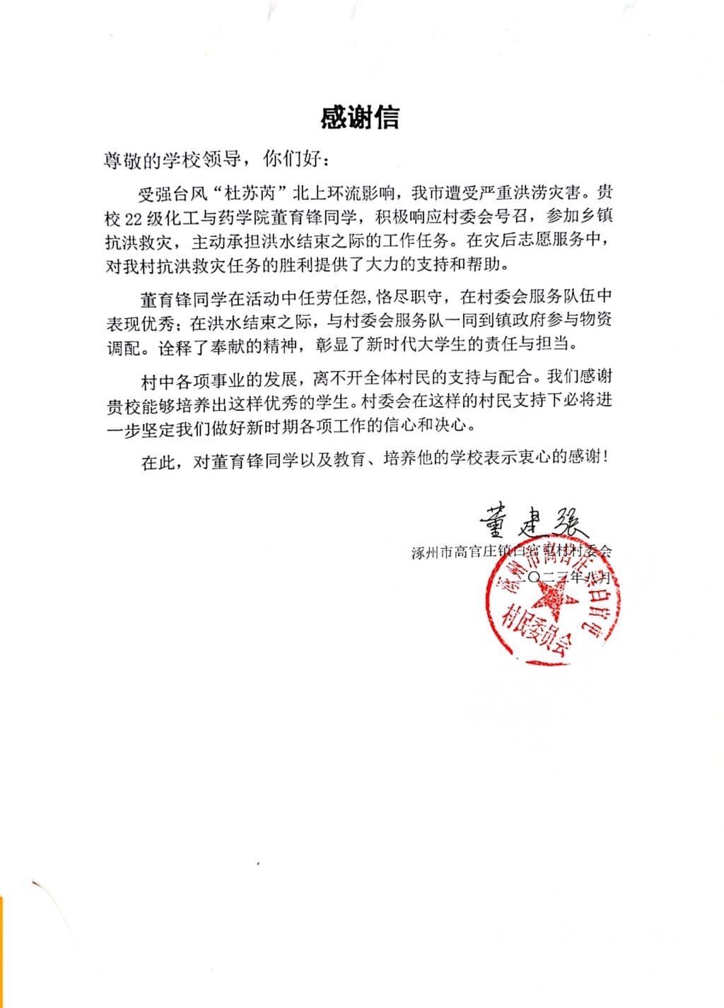 救援工作结束后,涿州市高官庄镇白官屯村村民委员会也向董育锋寄送了表扬信,一封简短的表扬信装的是我校化药学子的使命担当和家国情怀,也诠释了当代大学生的坚定信念和责任担当。