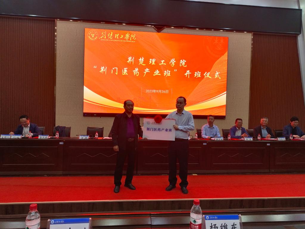 仪式上,荆门市医药产业协会会长梁群授予我校“荆门医药产业班”牌匾,并宣布产业班正式开班。与会领导为程志刚等八位企业家颁发了兼职教授聘书。