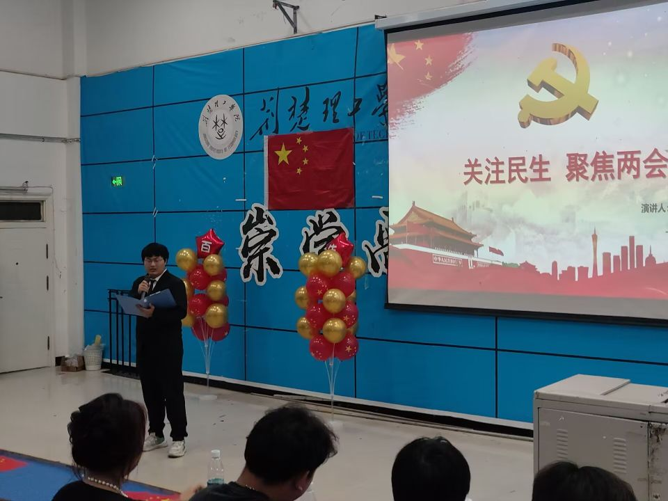 化工与药学院学生会组织建设部于4月28号晚上7点在钟楼103开展“庆‘两会’召开,颂和谐新篇”为主题的百生讲坛活动决赛,围绕习近平新时代中国特色社会主义思想,巩固拓展党史学习教育成果,营造良好的学习氛围,兴起学习热潮。所有参赛选手围绕“庆‘两会’召开,颂和谐新篇”的主题进行创作,用青年喜欢的语言、形式讲好党史故事,讲好党领导的中国青年运动故事。
